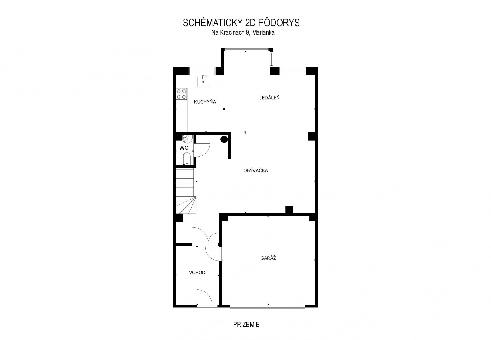 Prízemie domu tvorí vstup so zádverím, predsieň s množstvom úložného priestoru, veľká dvojgaráž, schodisko, WC s predsieňou, obývacia izba spojená s kuchyňou a jedálenskou časťou s výstupom na terasu. V priestore kúpeľne je umiestnený plynový kotol.