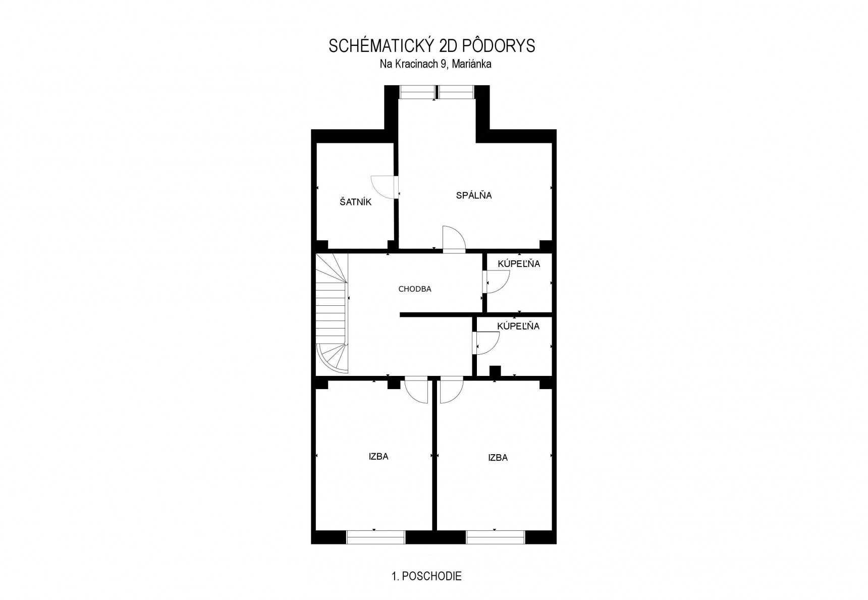 Na 1. poschodí sa nachádza schodisko, hala, spálňa s veľkým integrovaným walk-in šatníkom, dve detské izby a dve kúpeľne s WC.